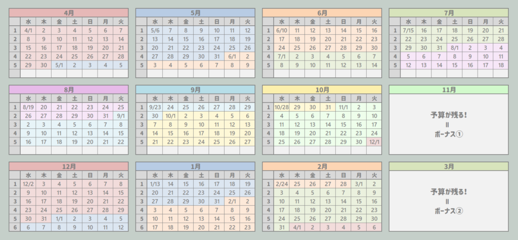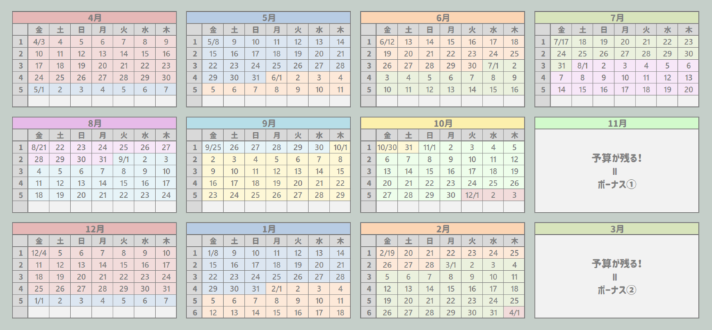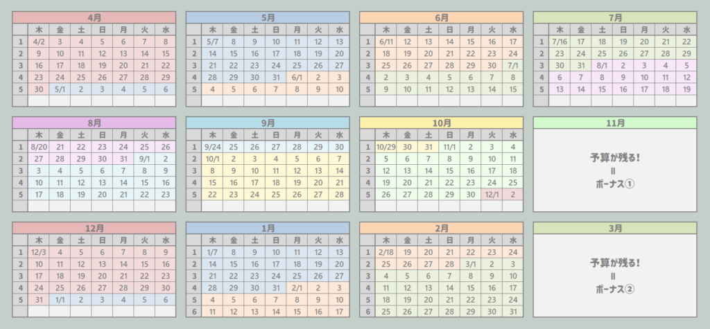 4~12月は5週(35日)、1~2月は6週(42日)ずつやりくりすると、11月と3月の予算が残り、ボーナスが作れます。