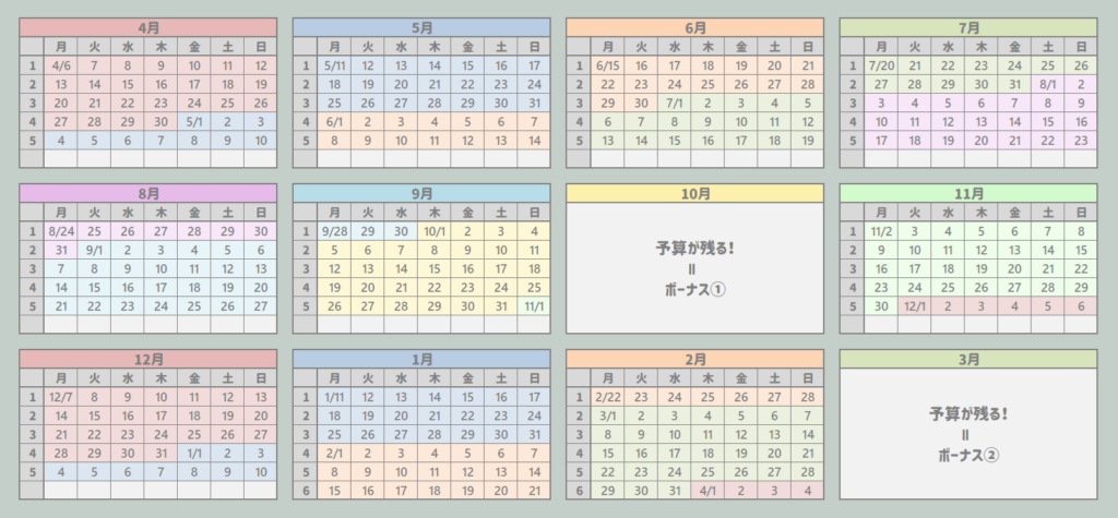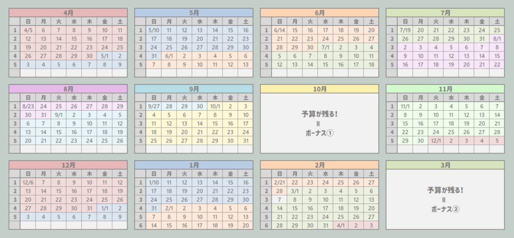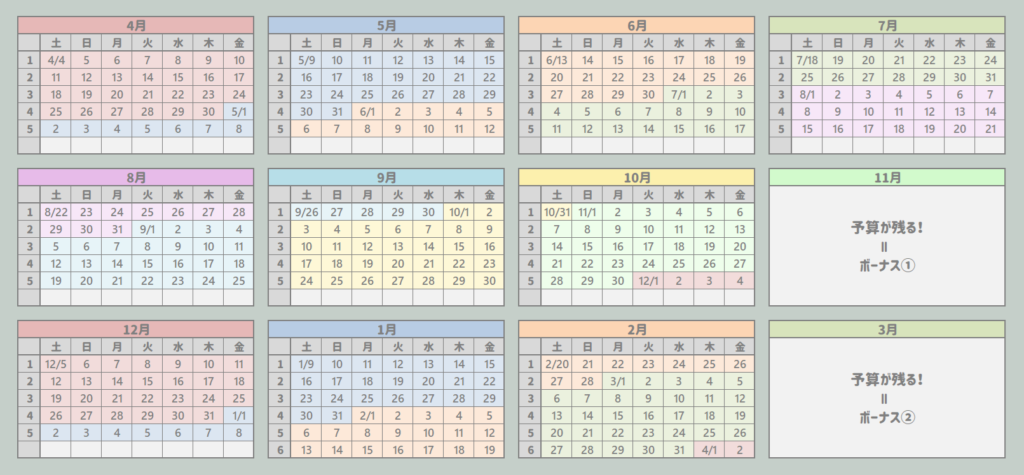 4~12月は5週(35日)、1~2月は6週(42日)ずつやりくりすると、10月と3月の予算が残り、ボーナスが作れます。