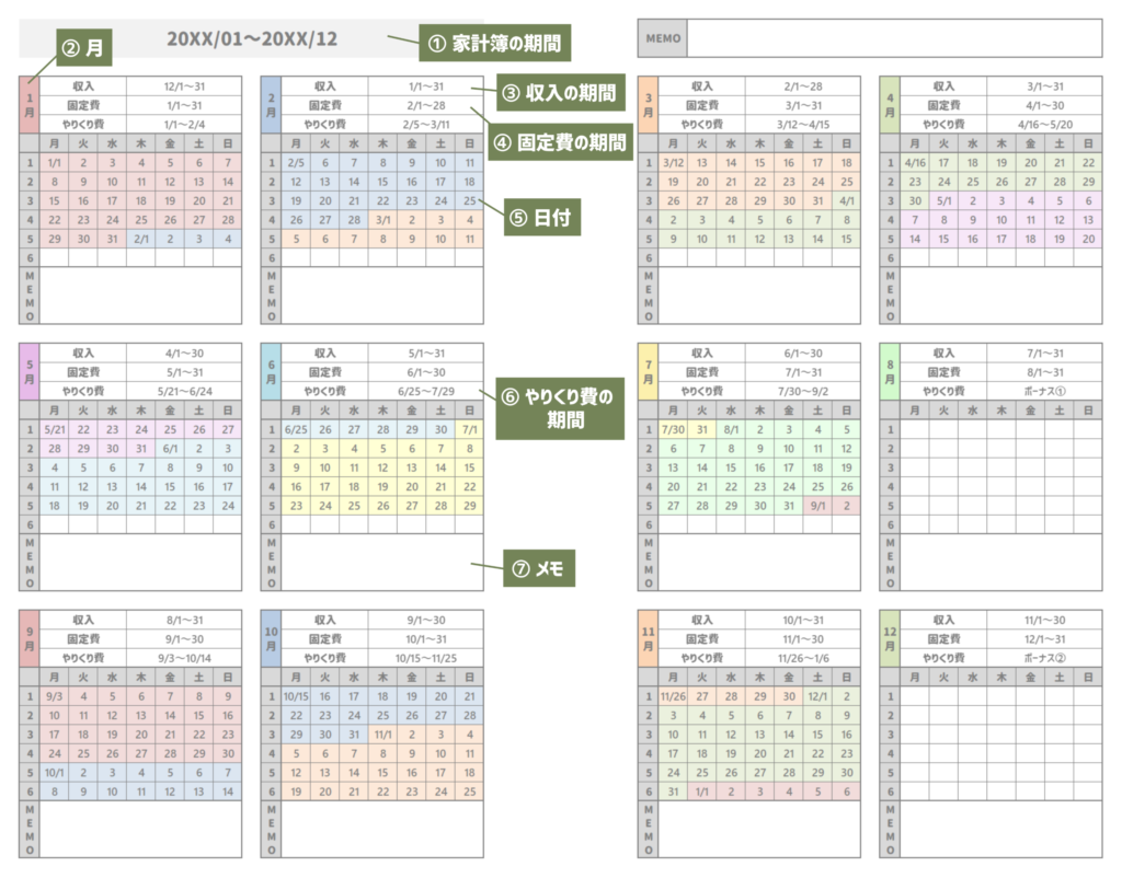 固定費の期間(通常の家計簿の期間)ごとに色分けして記入しています。